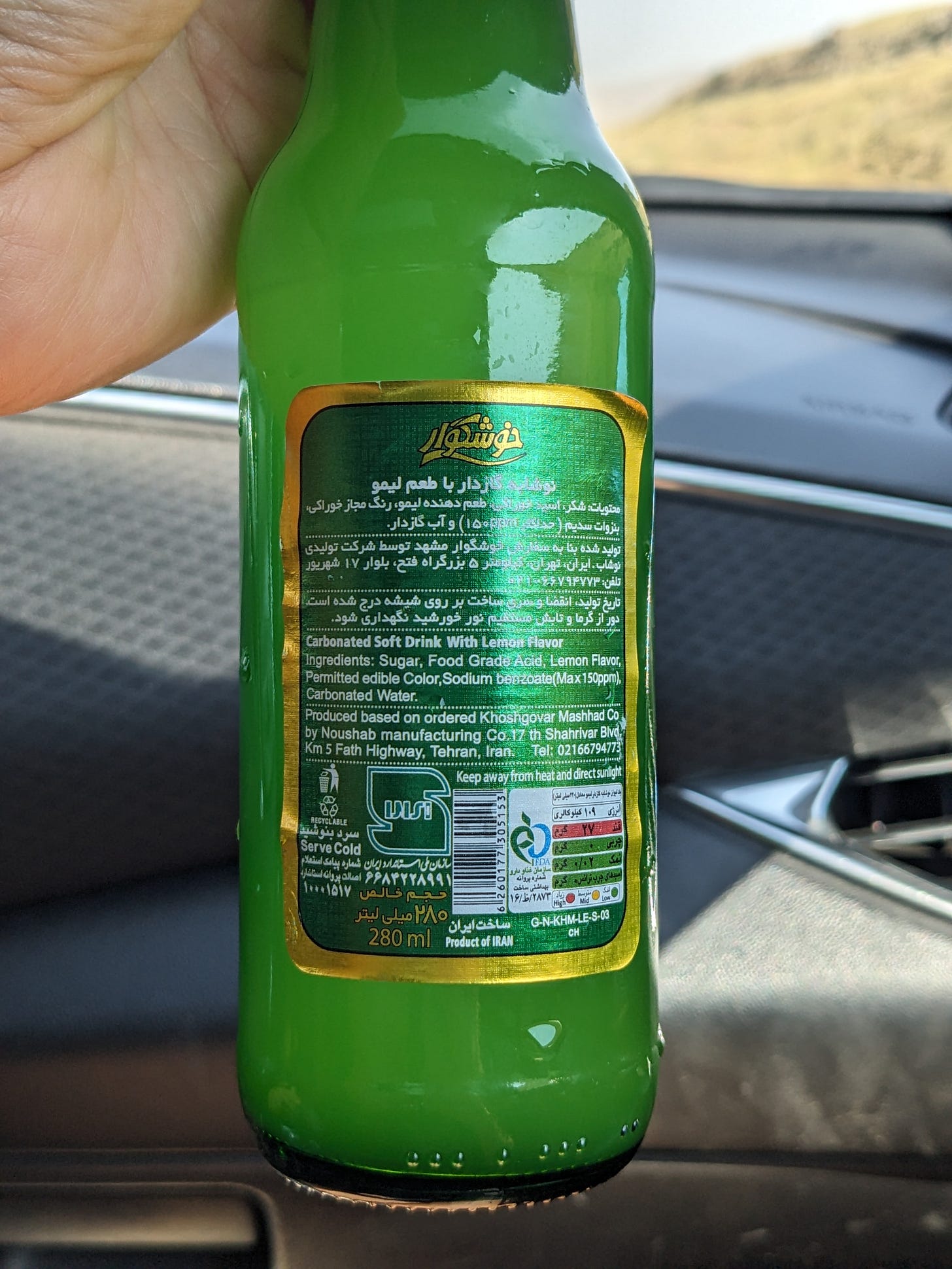 At the water stop, we met an Iranian man traveling around in his truck. We pantomimed some pleasantries and were delighted when he gave us two bottles of Persian soda pop. So cool!