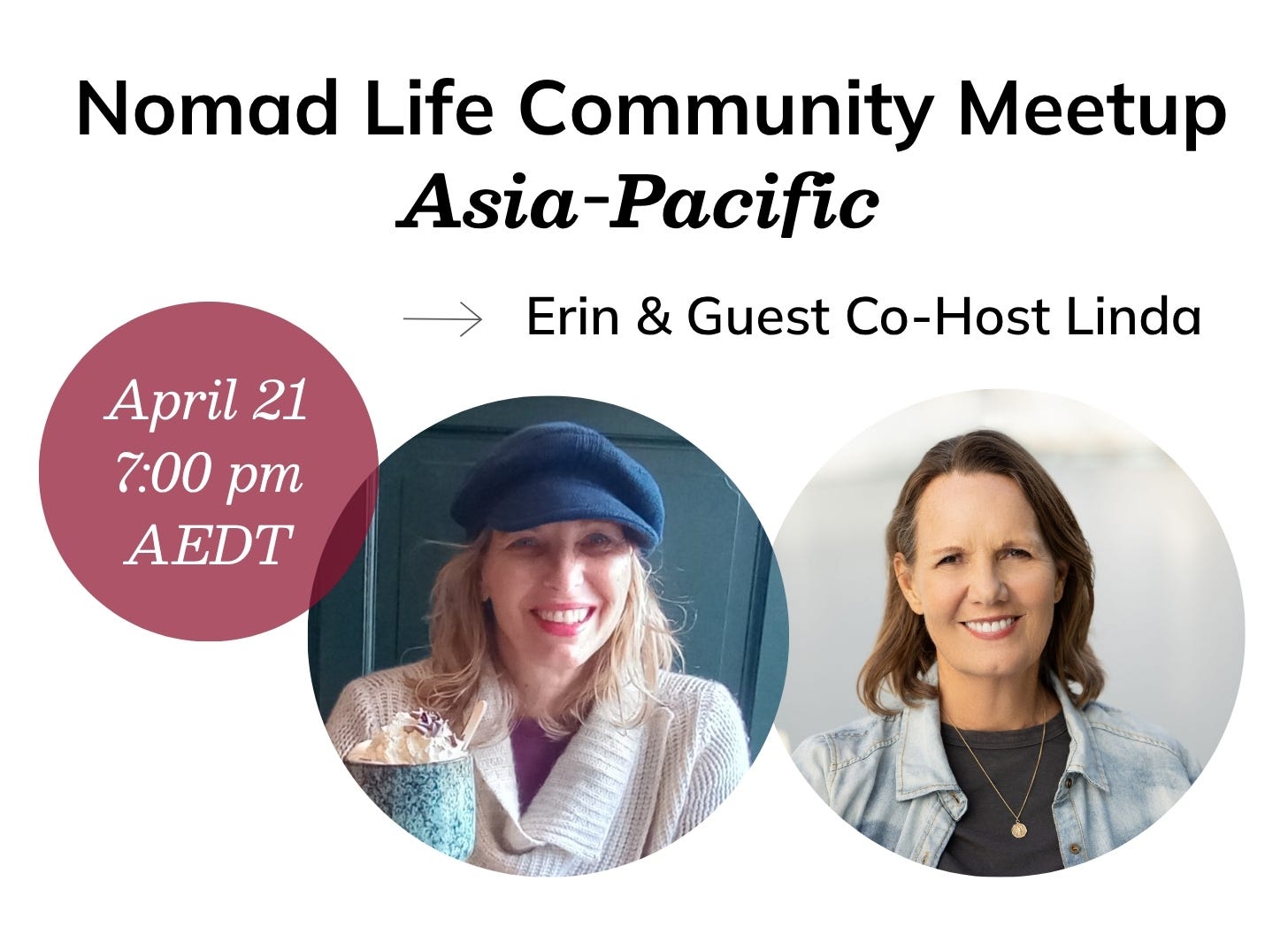 💌 This is your invitation to join me and our guest co-host Linda Jackson 🌏 of Shellphone Chronicles, in our friendly nomad circle on April 21 @ 7:00 pm AEDT. Timing chosen specifically for our Asia-Pacific nomads!