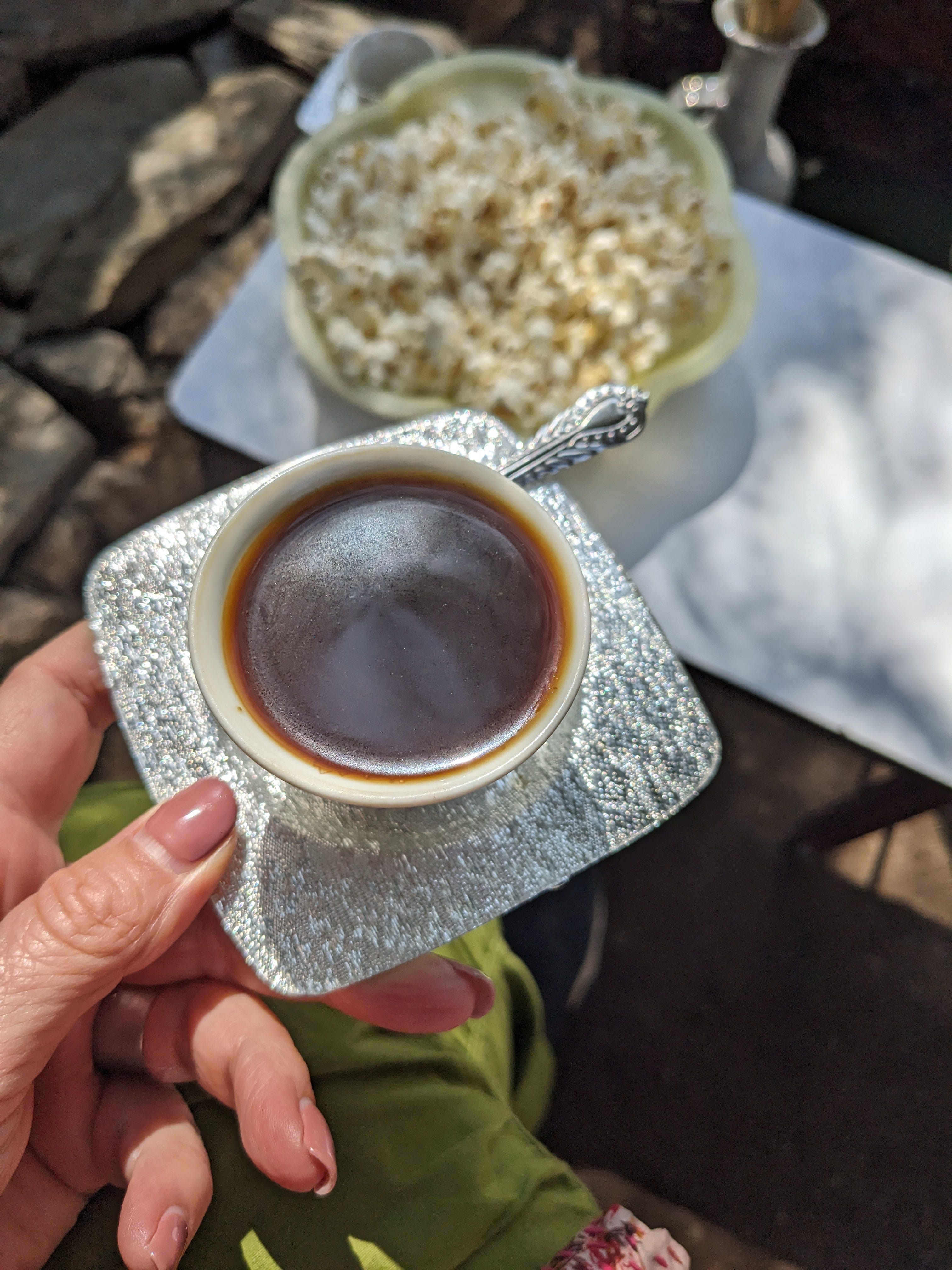 With each brew, sugar is offered with the coffee, and often popcorn too. Sometimes incense is burned, which mingles with the aroma of the freshly roasted coffee. The whole experience is magnificent.